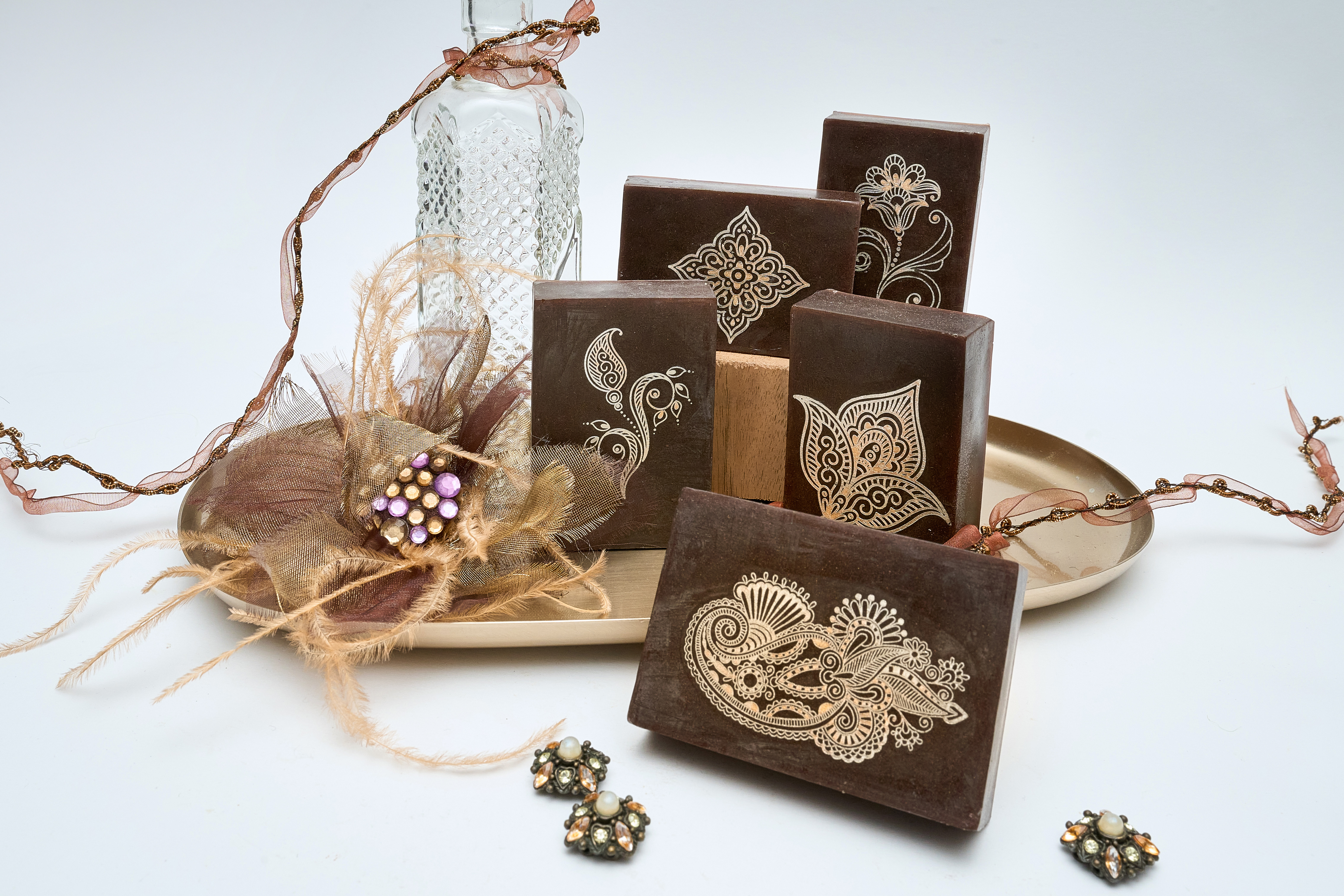 Warmer Braunton mit zarten, goldfarbenen Verzierungen auf der Vorderseite die wie kleine Kunstwerke wirken und jede Seife zu einem Unikat machen.